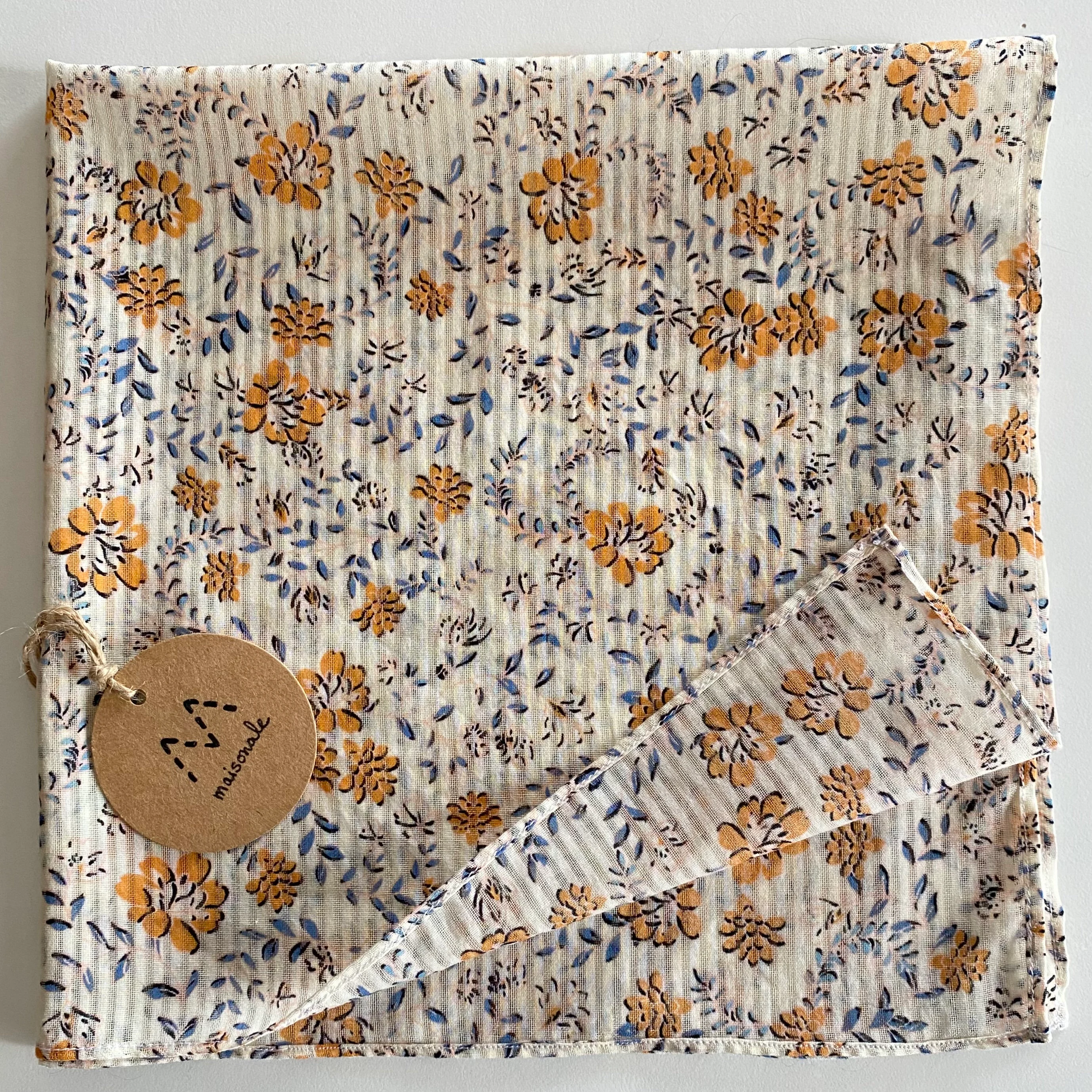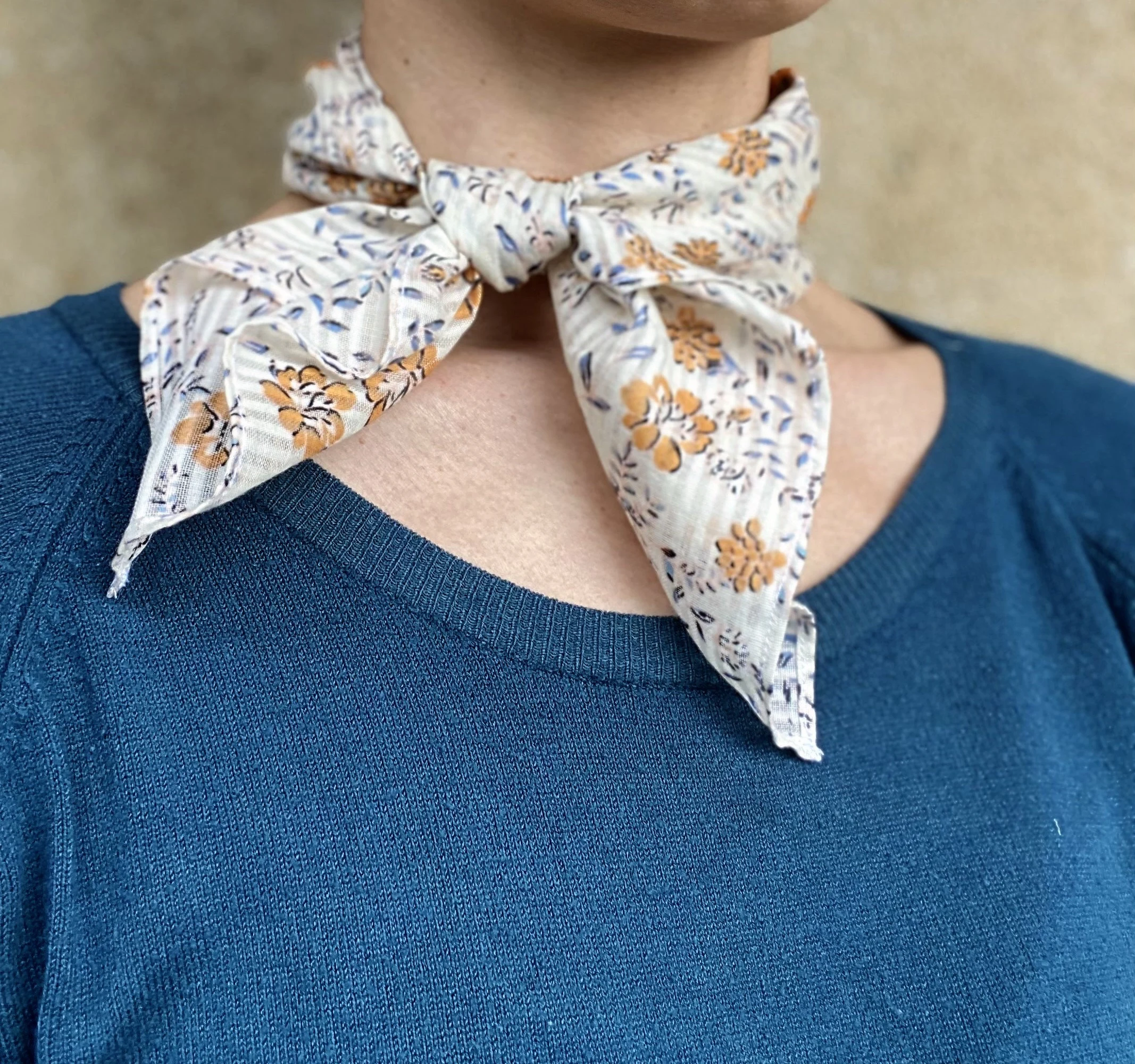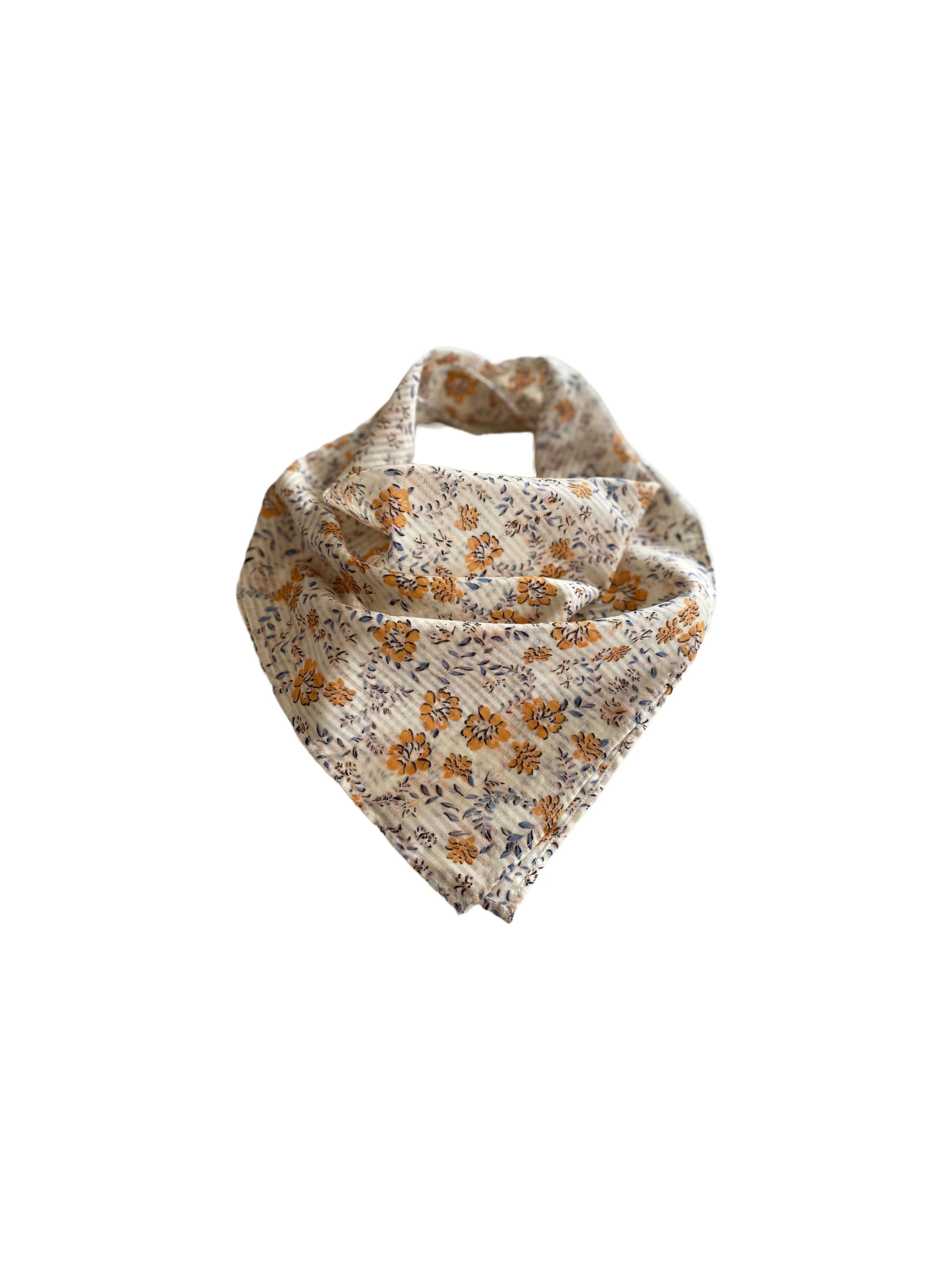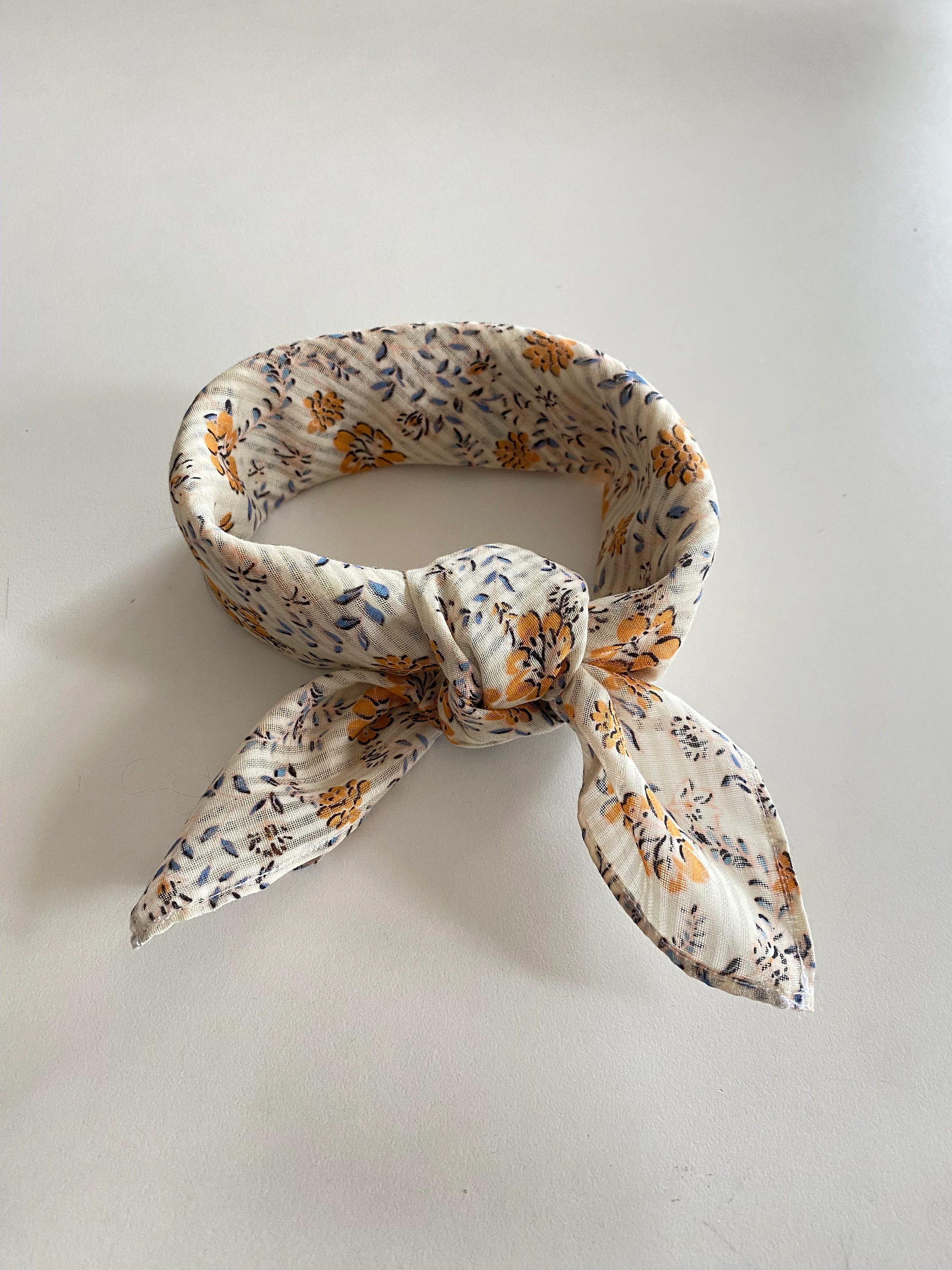 Avec ses jolis motifs floraux jaunes et bleus, ce petit foulard carré beige 100 % coton apportera une touche bucolique à votre tenue.